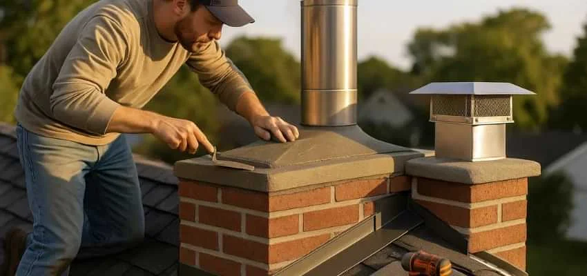 A proper crown protects the top courses. We form a reinforced, sloped crown with a drip edge and an expansion gap around the flue tile, preventing saturation and freeze damage in Dunbarton, Pickering.