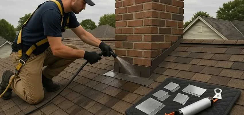 We examine crown slope, cap fit, mortar joints, brick or stone surfaces, and flashing transitions at the roofline. In Village East, Pickering this area is often the origin of leaks.